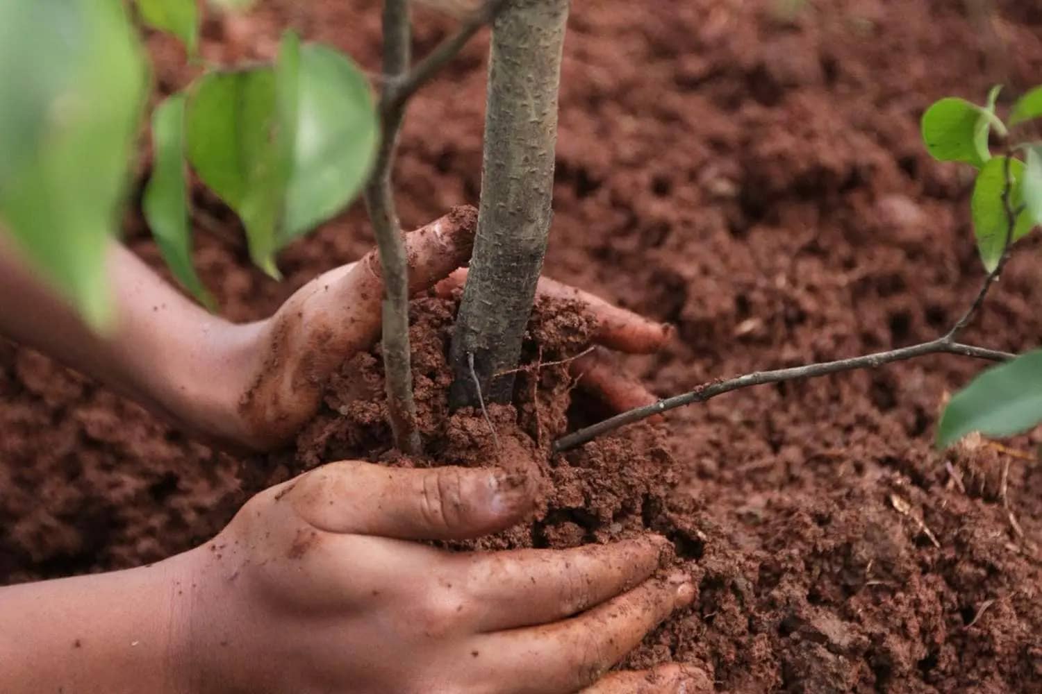 Илдизларни тарқатиб, кўчатни тешикнинг марказига эҳтиёткорлик билан жойлаштиринг. Ҳаво чўнтакларини олдини олиш учун илдизлар атрофида тупроқни сиқиб қўйиб, тешикни тўлдиринг. Илдиз ёқаси тупроқ даражасида ёки бироз баландроқ бўлиши керак.